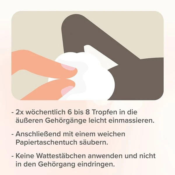 2x wöchentlich 6 bis 8 Tropfen in die äußeren Gehörgänge leicht einmassieren. Anschließend mit einem weichen Papiertaschentuch säubern. Keine Wattestäbchen anwenden und nicht in den Gehörgang eindringen.