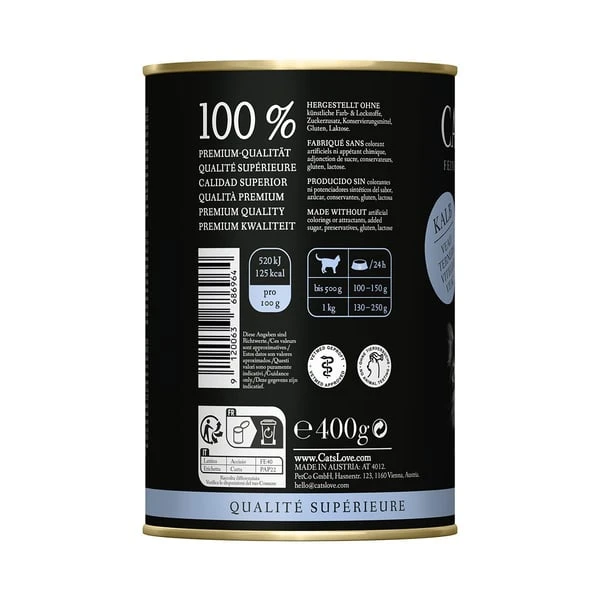 Kalb & Rind 92 % (davon Kalb 47 % (Kalbsherzen 26 %, Kalbsflfleisch 13 %, Kalbslunge 8 %) & Rind 45 % (Rinderherzen, Rindflfleisch, Rinderleber)), Mineralstoffffe, Lachsöl 0,25 %, Eierschalenpulver 0,1 %.