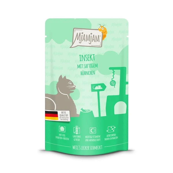 Huhn (36,5%), Insekten (32%), Fleischbrühe (30,5%), Eierschalen (0,5%), Mineralstoffe (0,5%)