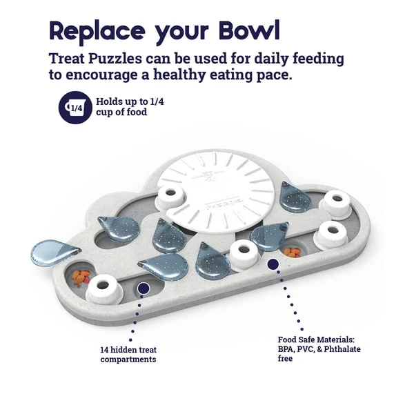 Deine schlauen Katzen werden die Herausforderung lieben, die ihnen Rainy Day Puzzle & Play von Nina Ottosson bietet. Sie können nach den Steckteilen schlagen und die Regentropfen drehen, um die 14 verborgenen Leckerlifächer aufzudecken. Passe den Schwierigkeitsgrad des Spiels an, damit es für Anfänger einfacher ist, während die ganz schlauen Katzen vor eine richtige Herausforderung gestellt werden können. Bei jedem Spielzeug ist ein englischsprachiges Infoblatt mit Tipps und Tricks enthalten, das dir verrät, wie du das Beste aus dem Spiel herausholen kannst. Ersetze den Standardnapf und füttere deine Katze mithilfe des Spielzeugs, damit sie ihre natürlichen Instinkte zur Jagd und Futtersuche ausleben kann.