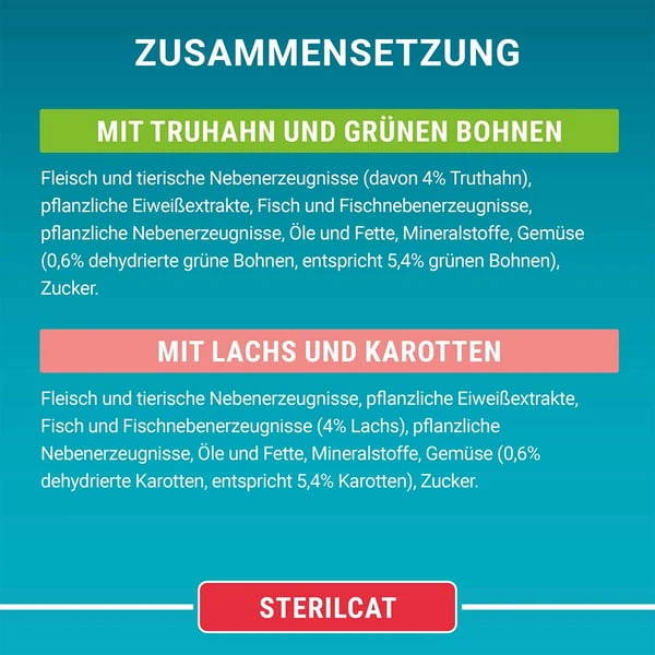 Fleisch und tierische Nebenerzeugnisse (davon 4% Truthahn), pflanzliche Eiweißextrakte, Fisch und Fischnebenerzeugnisse, pflanzliche Nebenerzeugnisse (0,55% Inulin), Öle und Fette, Mineralstoffe, Gemüse (0,6% dehydrierte grüne Bohnen, entspricht 5,4% grünen Bohnen), Zucker.