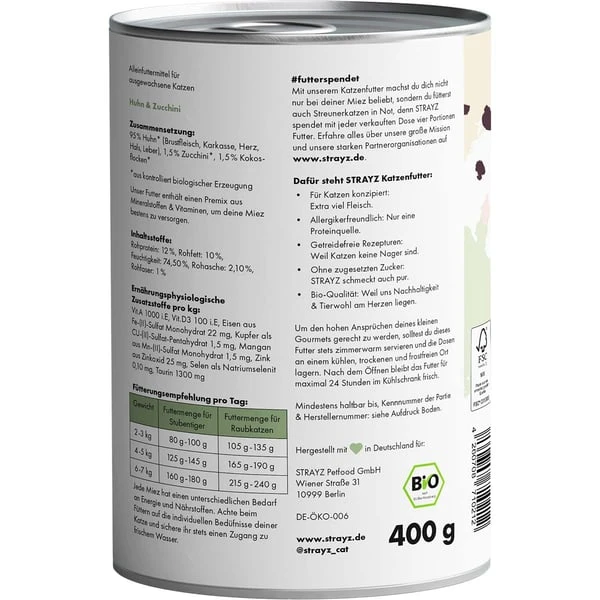 95 % Huhn* (ca. 75 % Brustfleisch, ca. 5 % Hals, ca. 5 % Herz, ca. 5 % Karkasse, ca. 5 % Leber), 2% Mineralstoffe & Vitamine, 1,5 % Zucchini*, 1,5 % Kokosflocken*