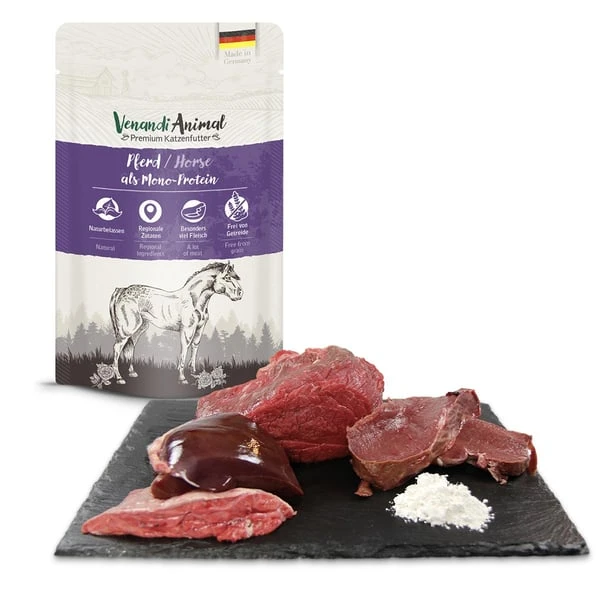 Pferdefleisch, -leber, -lunge, -herz, -magen 67 %, Fleischbrühe 32 %, Mineralstoffe 0,5 %, Eierschalen (getrocknet) 0,5 %.