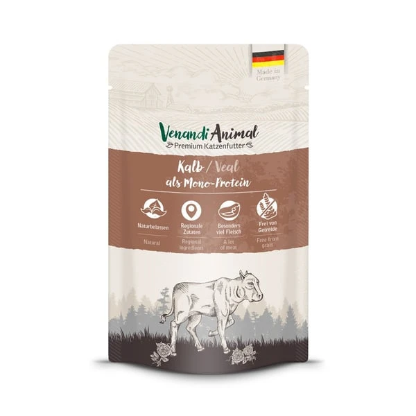 Kalbfleisch, -lunge, -herz, -niere, -milz, -leber 70 %, Fleischbrühe 29 %, Mineralstoffe 0,5 %, Eierschalen (getrocknet) 0,5 %.